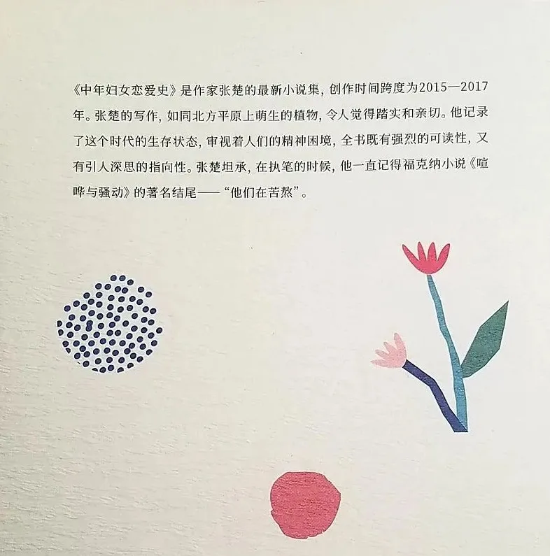 朱婷:张楚在访谈中曾谈到他写《中年妇女恋爱史》的缘由:即上街购物时,恍惚中瞥见的女人引起了他对从前许多女同学的回忆,由此他萌发了将她们的美好写进小说记录下来的想法。《中年妇女恋爱史》主人公的选择我认为很有新意——“中年妇女”。以往小说写恋爱情史多半会选择情窦初开、明媚干净的少女,而他偏偏选择了“一地鸡毛”的中年妇女。张楚正值中年,他是见过也接触过不少中年妇女,但他笔下的茉莉却又和中国千千万万的小城镇妇女不同:茉莉一生不停地恋爱、结婚、离婚,从乡下女孩成为城镇里的风云女性,最后陷入情感骗局,人财两空。张楚在这部作品中塑造的妇女最显著的特点便是物质与情欲,他毫不客气地将茉莉等人的欲望展露出来,但又没有道德批判的意味。小城镇保守封闭,但却生活着这样一些内心丰盈情感丰富的女人,不免让人感慨原始情欲与生命力的旺盛。张楚曾坦言,这本书他并不只局限于描写男女情事,那样格局太小,他更想写的是社会的现状,也就是想从这些女性的经历侧面反映出时代对人的影响。他只是选用了小城镇人的视角,用敏锐的目光去观察小城女人的情感生活,再用细腻笔触将她们内心对情爱物质的大胆追求写下来,供以世人了解。